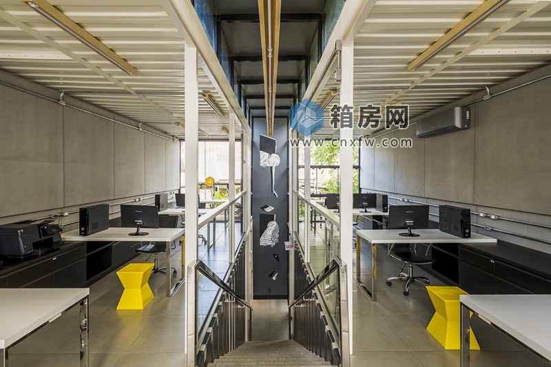 二層是開放式的辦公區(qū)域,白色的辦公桌擺放在兩側(cè)的集裝箱,光線透過大量的玻璃窗戶照射進(jìn)來,寬敞明亮,工作起來也更有精神了。