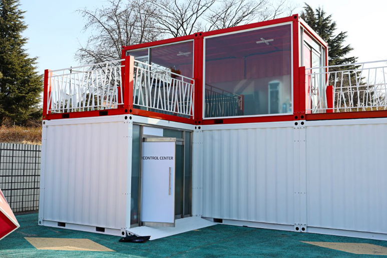 位于廣場(chǎng)另外兩邊的是兩個(gè)二層的集裝箱展柜,為現(xiàn)場(chǎng)的人提供演出的咨詢(xún)接待服務(wù),也可以在這里歇歇腳。這兩座集裝箱建筑的結(jié)構(gòu)都比較簡(jiǎn)單,為的是可以在短時(shí)間內(nèi)建成并投入使用。
